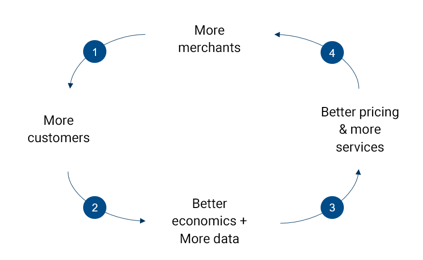 The BNPL economic model relies on a positive feedback cycle (flywheel) that helps winners keep winning.